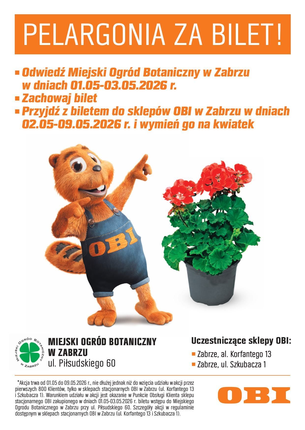 Zakupiony bilet będzie można wymienić na sadzonkę pelargonii w dwóch zabrzańskich sklepach sieci OBI: przy al. Korfantego 13 oraz ul. Szkubacza 1. Wymiana będzie możliwa w dniach od 2 do 9 maja 2026 r. w punktach obsługi klienta.